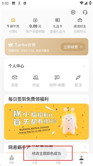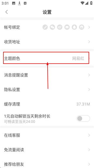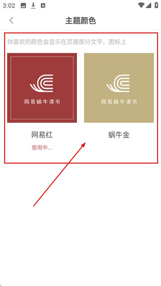 3、在主题颜色选择页面,可选择网易红、蜗牛金等主题颜色,更换软件主题啦。