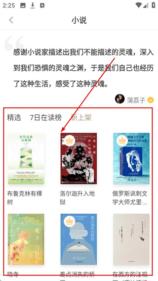 1、在小说分类页面,可浏览精选、7日在读榜等书籍列表,找到感兴趣的书籍啦。
