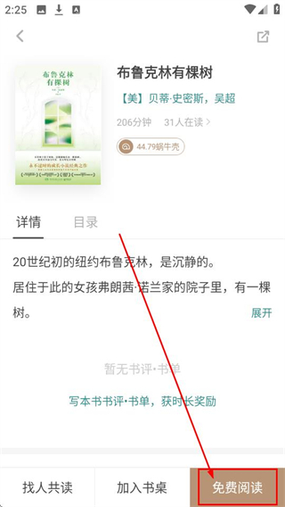 2、点击感兴趣的书籍进入详情页后,点击【免费阅读】,可进入书籍阅读页面哦。