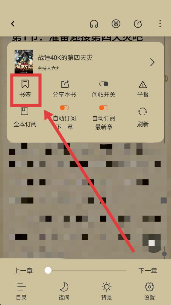 3、在功能菜单点击【书签】,即可添加当前章节为书签,方便下次继续阅读哦。