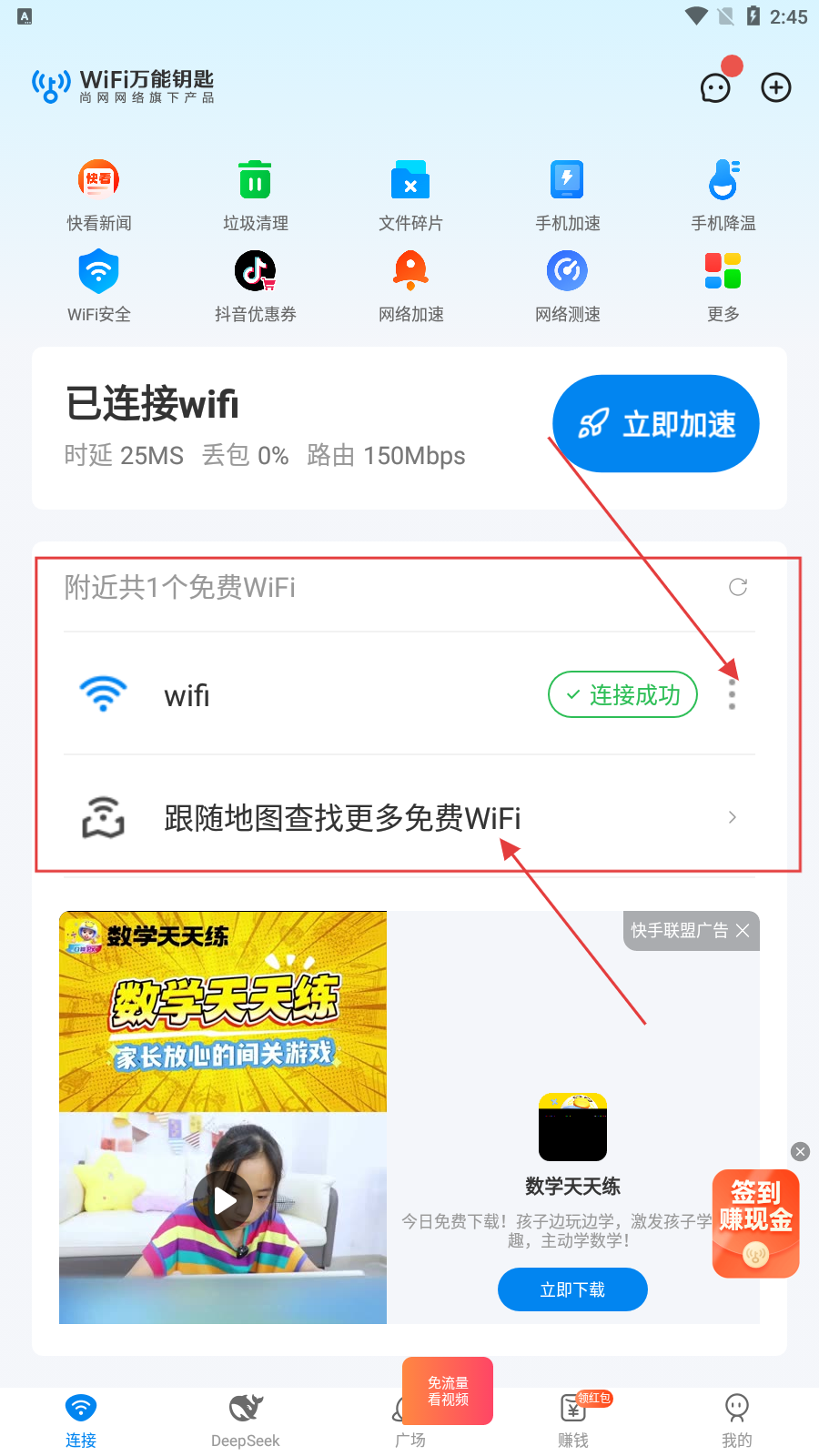 1、进入软件首页,能看到已连WiFi和附近免费WiFi,想找更多,点【跟随地图查找更多免费WiFi】超方便。