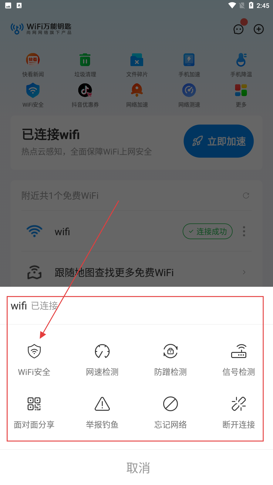 2、点已连WiFi旁的三点,弹出WiFi安全、网速检测等功能,选【WiFi安全】,检测网络安全超重要。