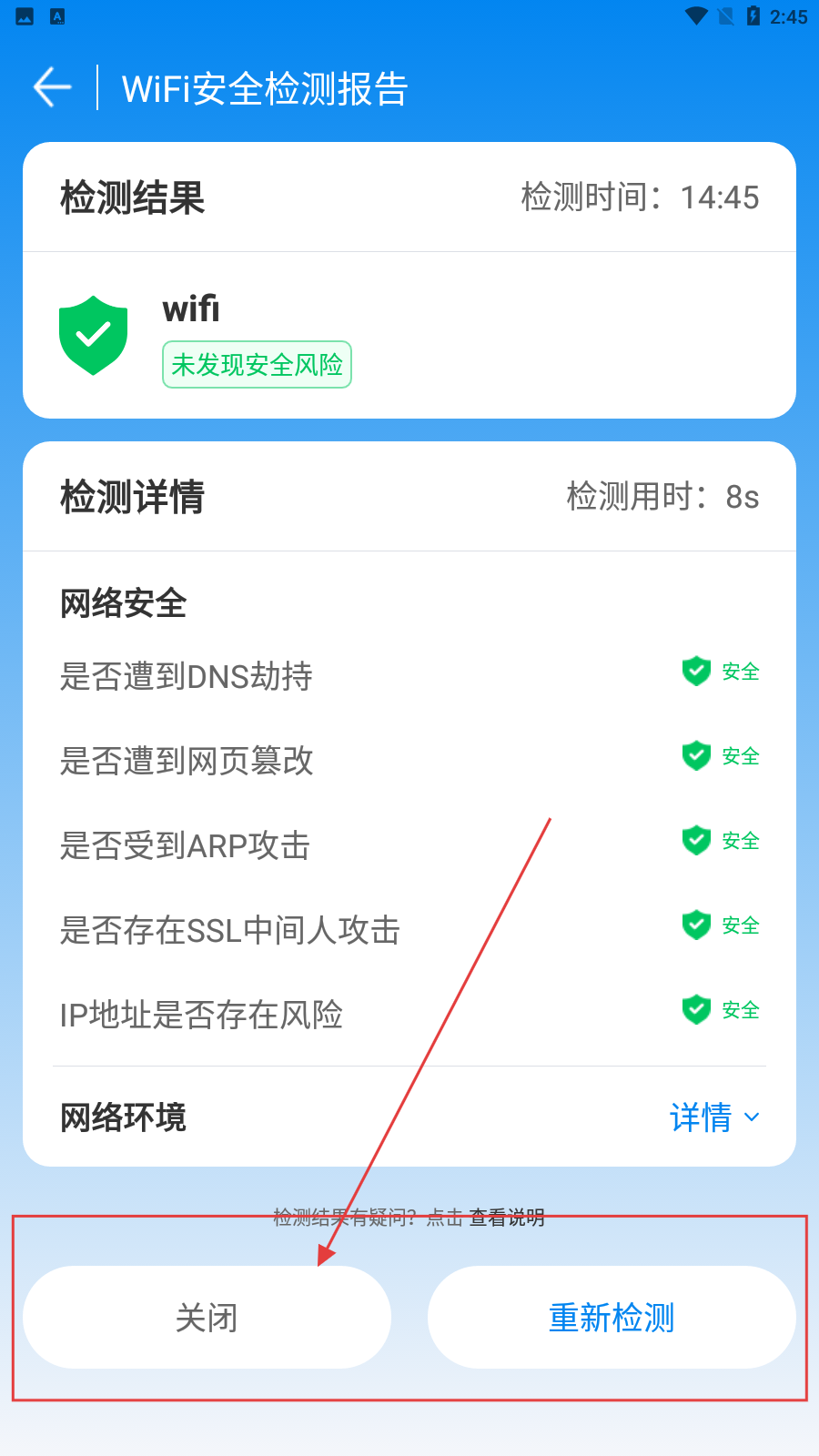 3、WiFi安全检测完,看报告,没风险就点【关闭】,有问题就【重新检测】,保障上网安全。