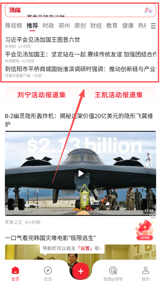 2、浏览资讯时呢,顶端区域划分了视频、推荐、时政等垂直频道,内容从国家大事到本地新闻都有覆盖。