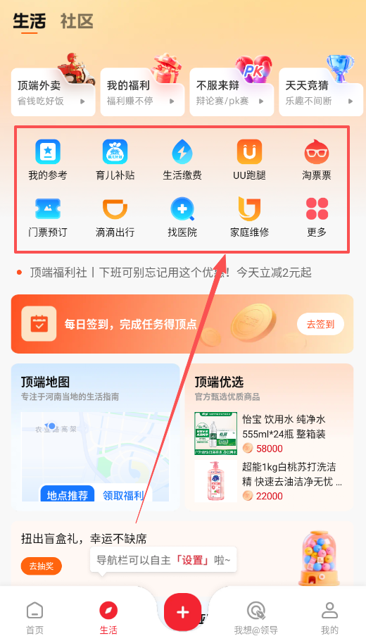 3、进入生活社区后呢,你会发现这里整合了外卖、福利社、辩论赛等日常服务,还能顺手完成每日签到任务呢。