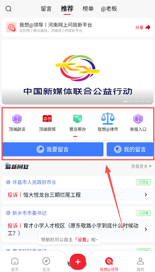 4、有诉求需要反映的话呢,可以点开我想@领导板块,选择我要留言来提交问题,之后在最新回复里查看办理进度。