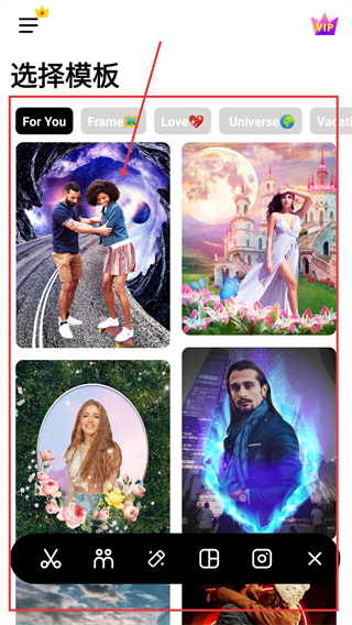 1、在模板选择页,可按【ForYou】【Frame】等分类选心仪模板,点目标模板就能进入编辑页面啦。