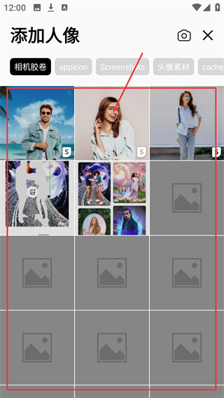 3、在添加人像页,选【相机胶卷】分类里的目标照片,就能将其替换到模板对应的人像区域啦。