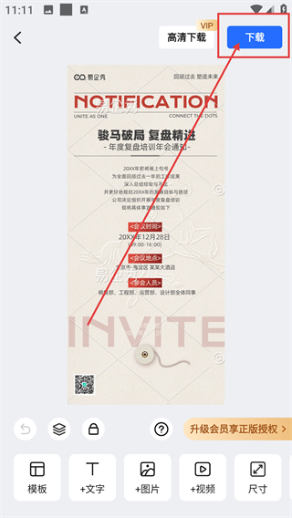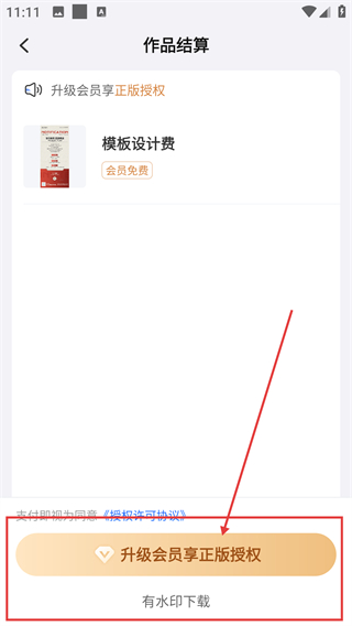 4、在作品结算页,可选升级会员享正版授权,也能直接点【有水印下载】获取模板啦。