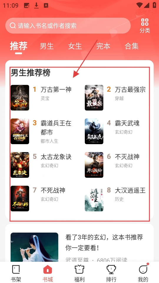 1、打开APP的书城页面,在男生推荐榜中选择目标小说,比如【万古第一神】,点击进入阅读页面啦。
