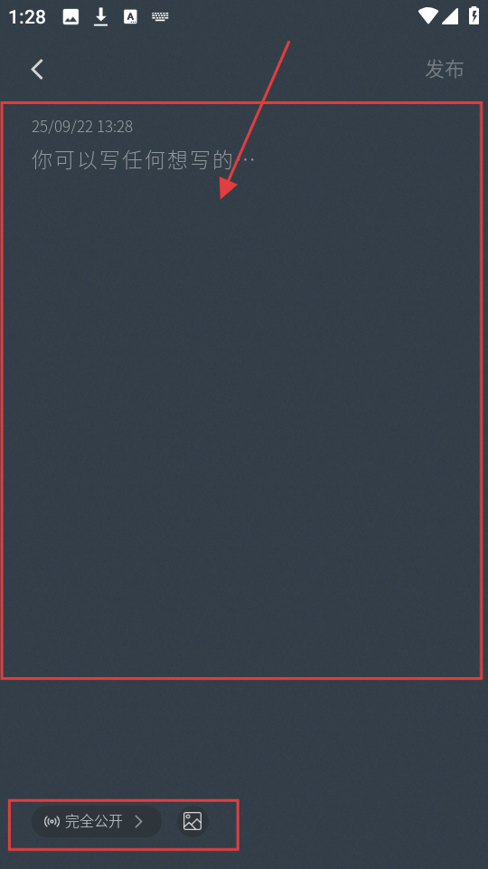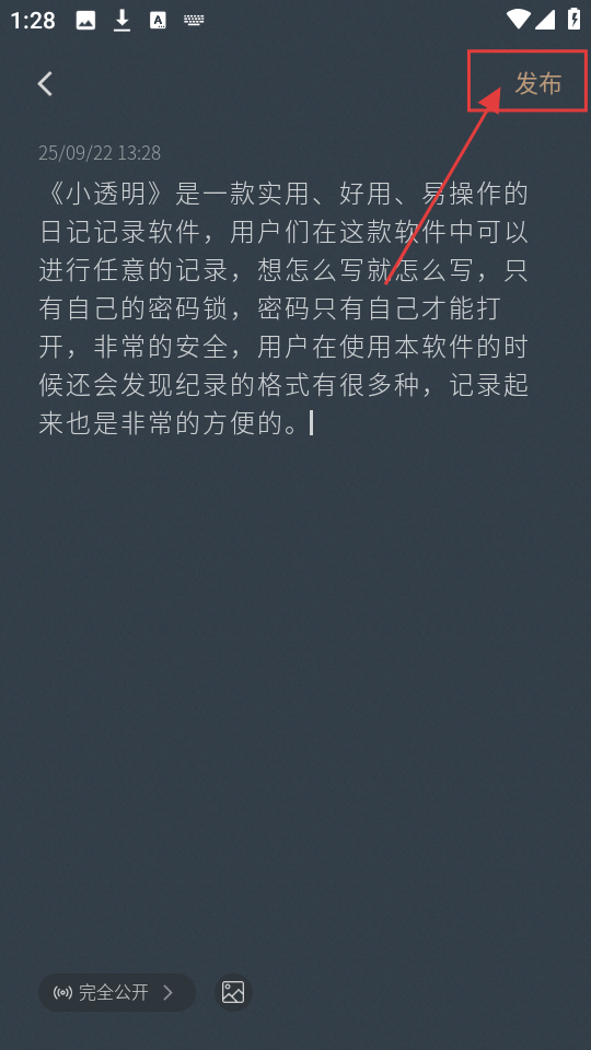 2、日记编辑页面里,能输入想写的内容,还可以设置【完全公开】权限、添加图片等,功能很丰富哟。