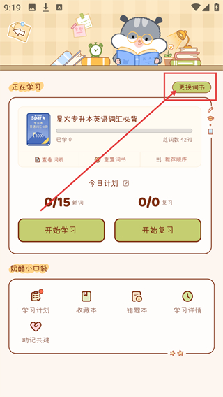 2、进入单词本页面后,点击右上角的【更换词书】按钮,可进入词书管理界面,调整当前学习的词书哦。