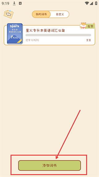 3、在词书管理页面,点击底部的【添加词书】按钮,即可进入词书选择界面,挑选新的词书来学习呀。