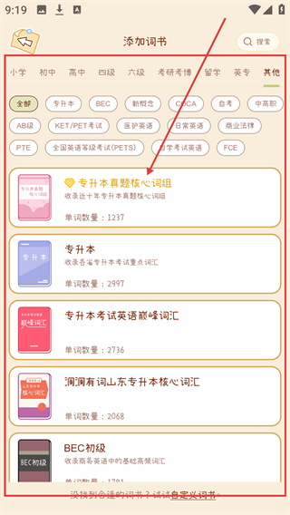 4、进入添加词书页面后,选择目标词书(如【专升本真题核心词组】),即可将其添加到学习列表中啦。
