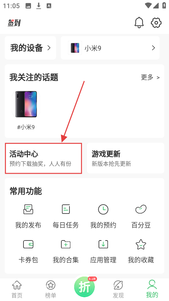 2、进入个人页面后,点击【活动中心】,就能查看正在进行的游戏活动,参与抽奖哦。