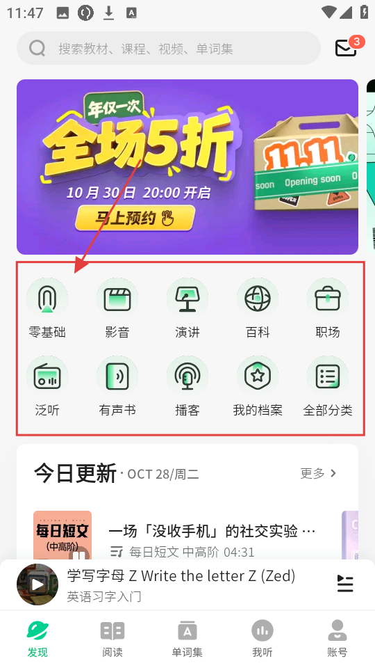 1、在发现页点【零基础】分类哦,这是找到英语学习课程的入口呢。