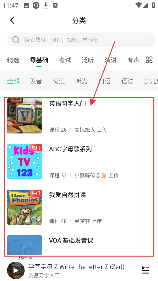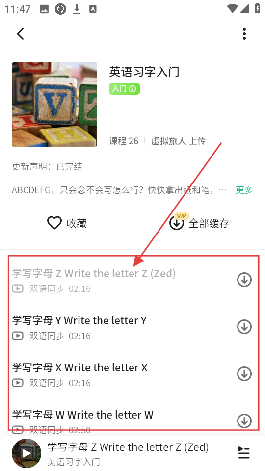 3、进入课程后,选择【学写字母Z-Write-the-letter-Z-(Zed)】课程就点击进入哦,开始具体字母的学习啦。