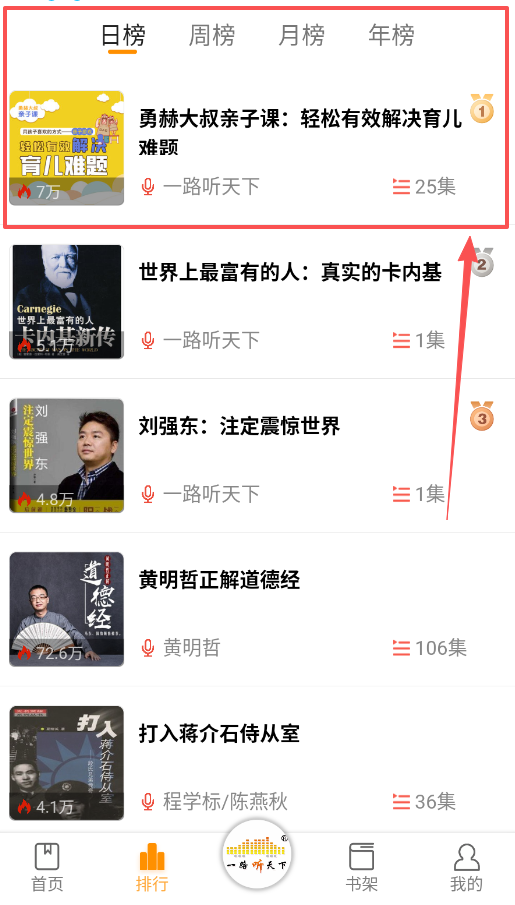 2、想找热门作品,就点击排行板块,那里有日榜、周榜等不同榜单,列出了平台最受欢迎的有声书和课程。