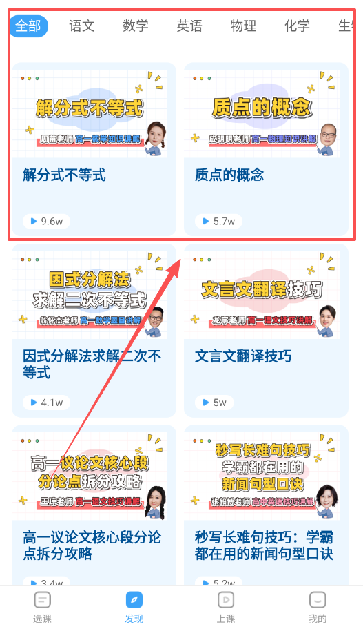 2、其次,在发现页面,你可以浏览全部科目或按语文、数学等分类查看热门内容,比如解分式不等式或质点的概念视频。