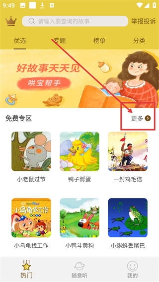 1、在儿童故事首页的免费专区旁,点击【更多】按钮,就能进入免费故事的完整列表页面啦。