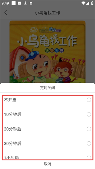 4、点击定时关闭后,可选择10分钟后、20分钟后等时长选项,设置后故事就会按时自动关闭啦。