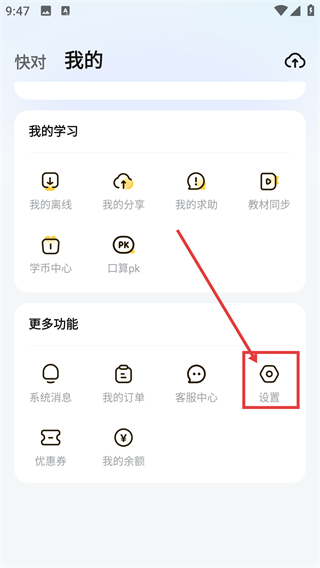 1、在快对的个人中心页面,找到更多功能里的【设置】选项并点击,进入设置界面可管理账号相关配置啦。