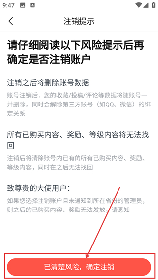 4、进入注销提示页面后,阅读风险提示内容,确认后点击【已清楚风险,确定注销】按钮,即可提交注销申请啦。