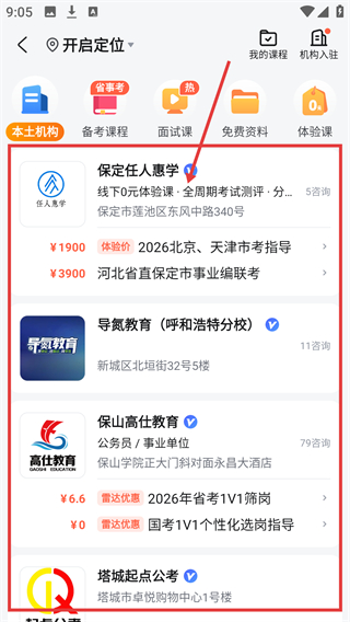 2、进入本土机构页后,能看到不同机构的课程,比如【保定任人惠学】的线下体验课,可按需了解备考资源哦。