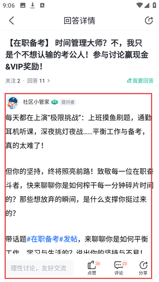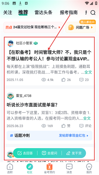 3、切换到社区页,点感兴趣的帖子比如【在职备考】相关内容,能进入帖子详情页参与讨论啦。