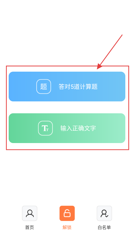 4、在解锁选择页面,有【答对5道计算题】和【输入正确文字】两种解锁方式,选择其一完成操作即可解锁。