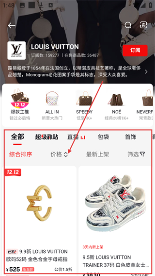 1、在红布林首页,点击品牌栏里的【LOUISVUITTON】图标,就能进入该品牌的商品列表页啦。