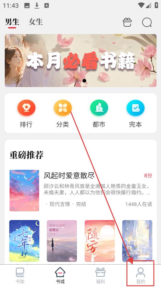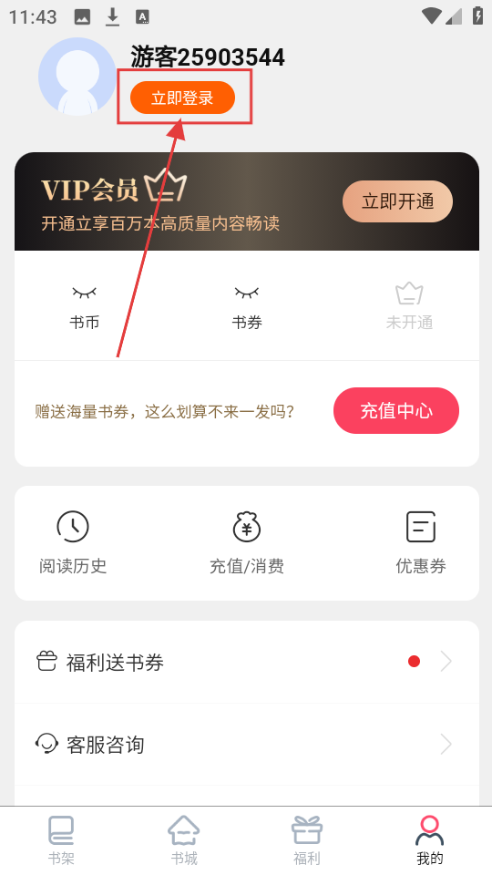 1、在书城界面点击【我的】,就能进入个人页面,开启登录等操作啦,是不是很简单呀。