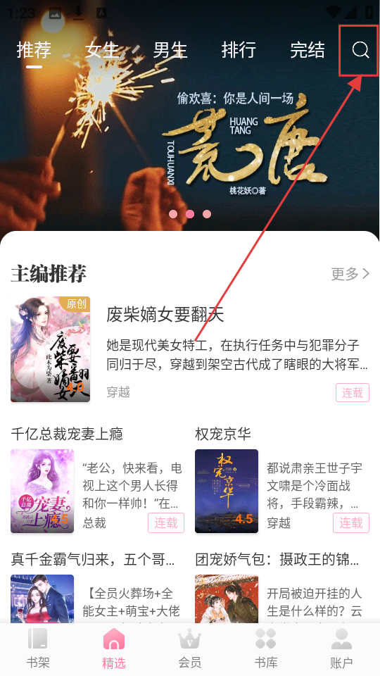 1、在精选页面点击右上角【搜索】图标,进入搜索页面可查找心仪小说哦。