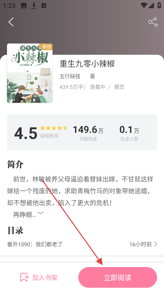 4、在小说详情页点击【立即阅读】按钮,就能开始阅读该小说啦。