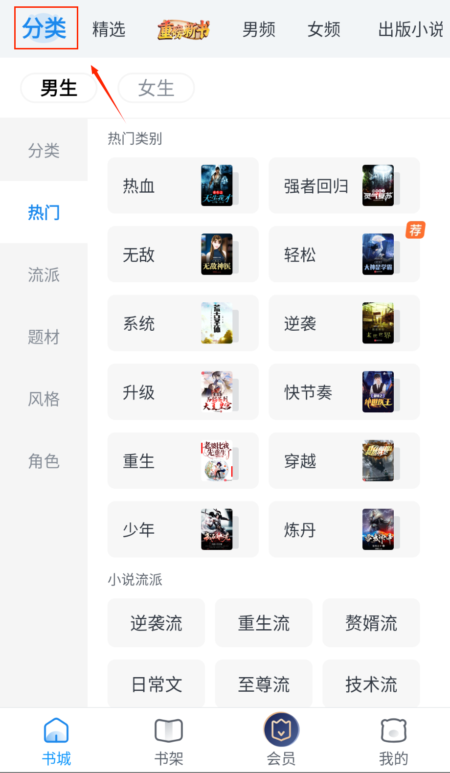 2、通过分类导航可以按题材筛选,男频女频满足不同喜好,出版小说区还有实体书电子版。