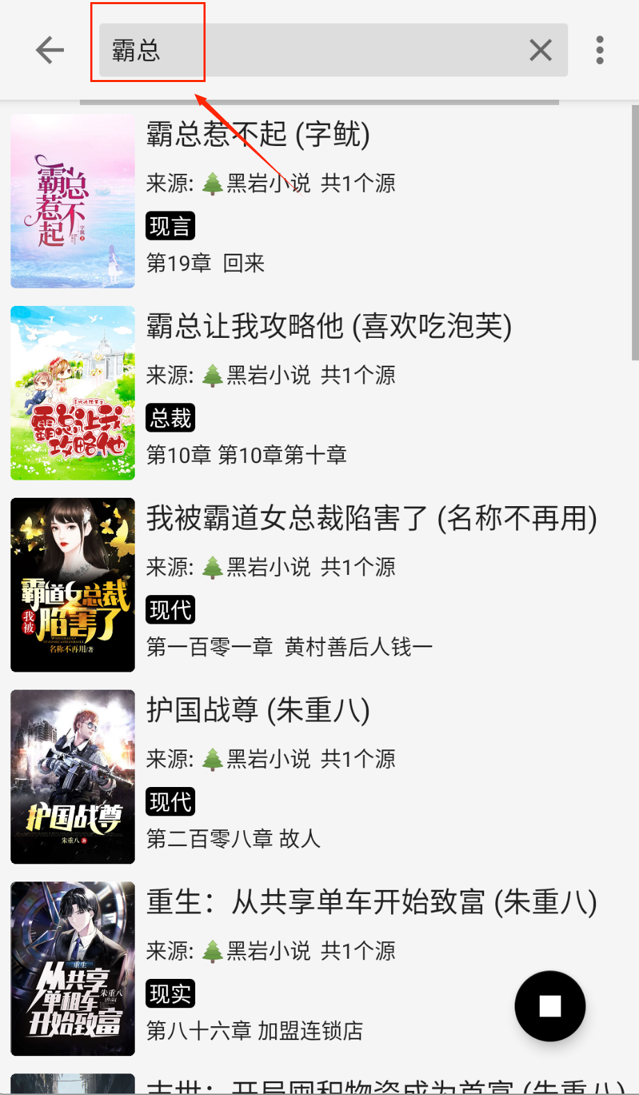 2、通过搜索功能输入关键词比如"霸总",会显示相关小说列表,每本书都配有封面图并标注来源平台和分类标签,还能看到最新章节信息。