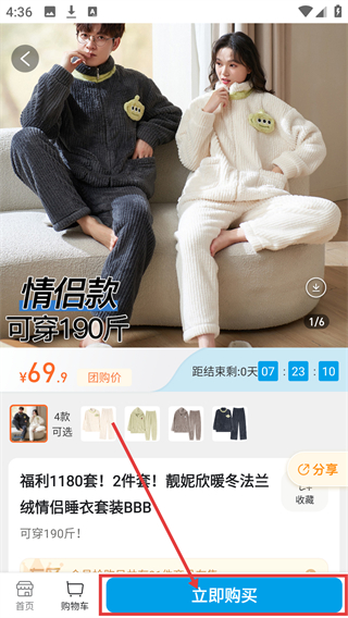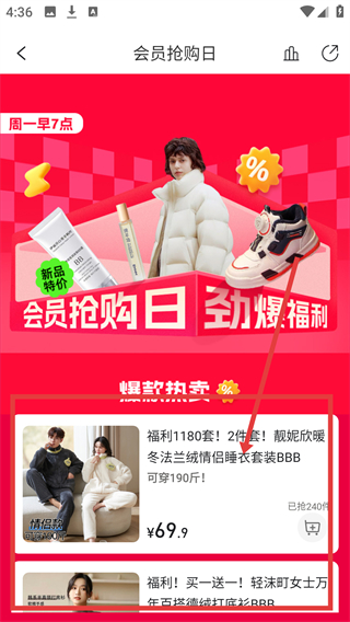 2、进入会员抢购日页后,挑选心仪商品(如情侣睡衣),点击就能进入该商品的详情界面哦。