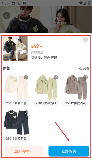 4、在规格选择页,选好【颜色】【尺码】后,点击【立即购买】就能进入下单支付流程啦。