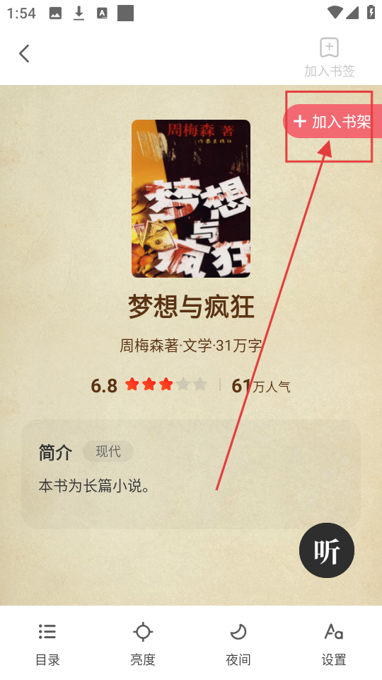 2、在小说详情页点击【+加入书架】,就能把《梦想与疯狂》添加到书架啦。
