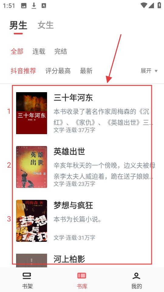 1、在书库页面,可浏览男生、女生分类下的书籍列表,找到感兴趣的书籍啦。