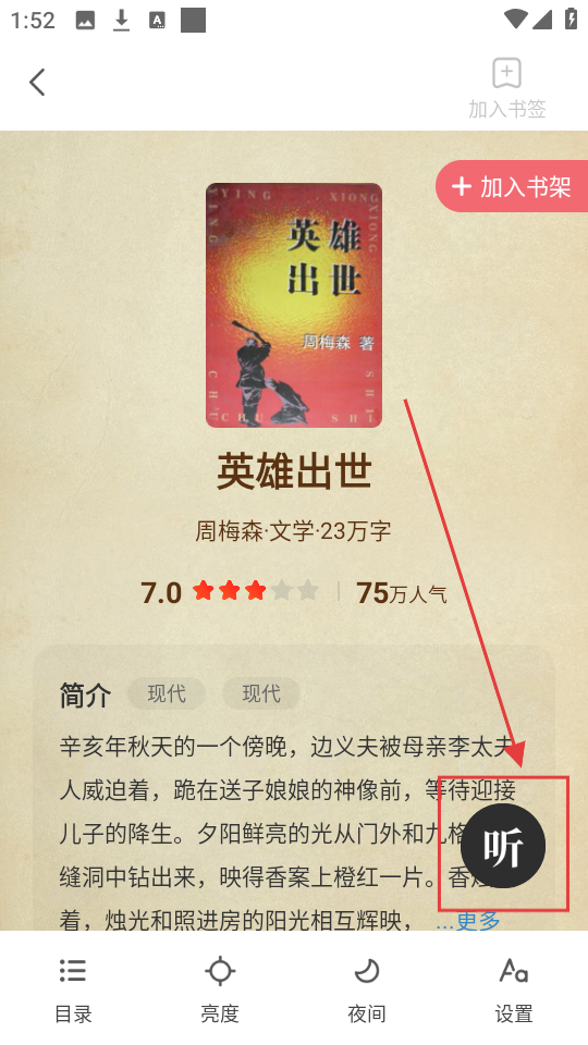 2、点击感兴趣的书籍进入阅读页面后,点击【听】,可触发听书语音包下载提示哦。