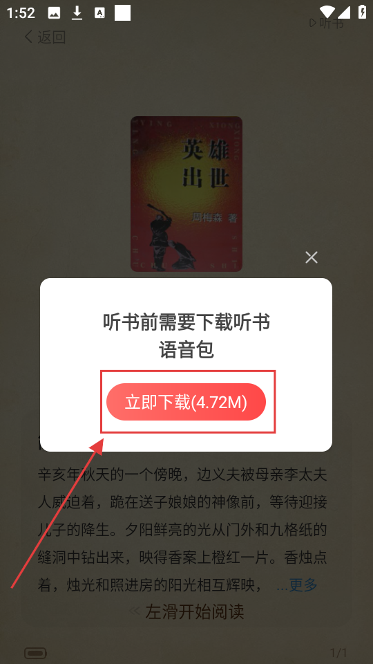 3、在提示框中,点击【立即下载(4.72M)】,可下载听书语音包,准备听书啦。