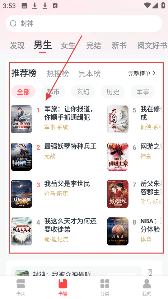 1、我们进入软件,看到男生频道推荐榜有《军旅:让你报道,你顺手抓通缉犯》等小说,若感兴趣,点击小说,即可进入详情页啦。