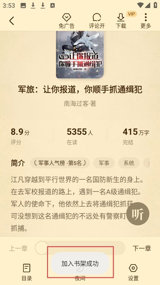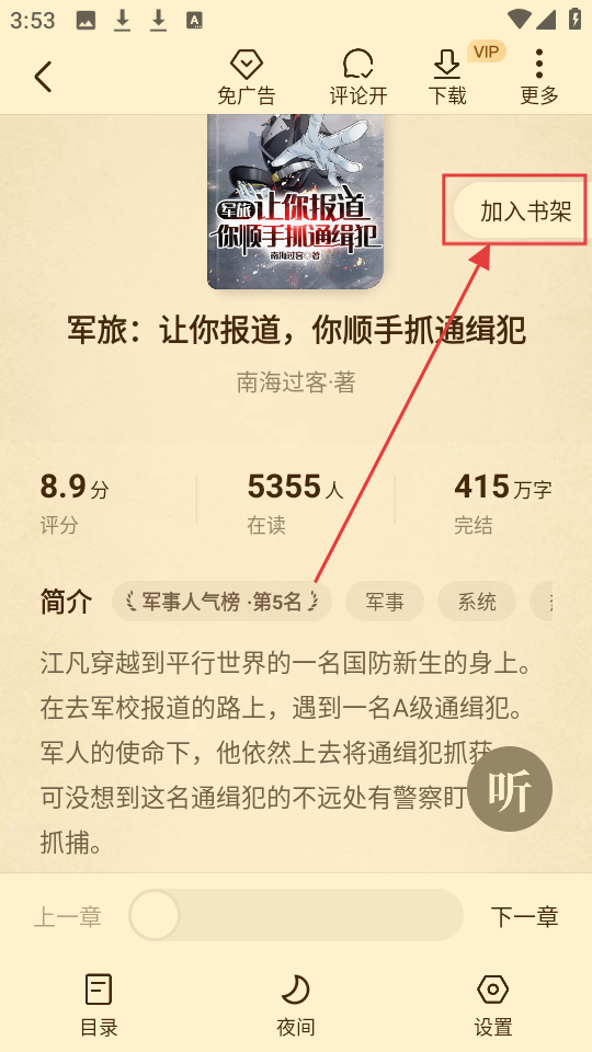 2、进入《军旅:让你报道,你顺手抓通缉犯》详情页,若想收藏,点击【加入书架】,就能尝试收藏操作哦。