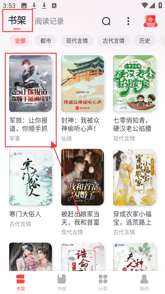 4、进入书架页面,能看到刚加入的《军旅:让你报道,你顺手抓通缉犯》,点击它,即可继续阅读呢。