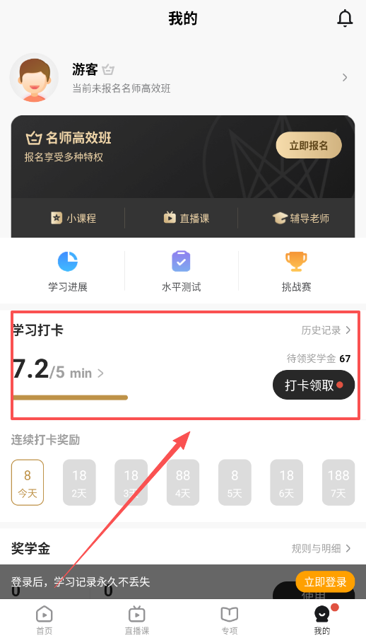 4、坚持学习的关键在于利用好激励工具。记得每日在“我的”页面完成学习打卡,积累连续天数以获取奖励。