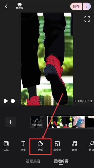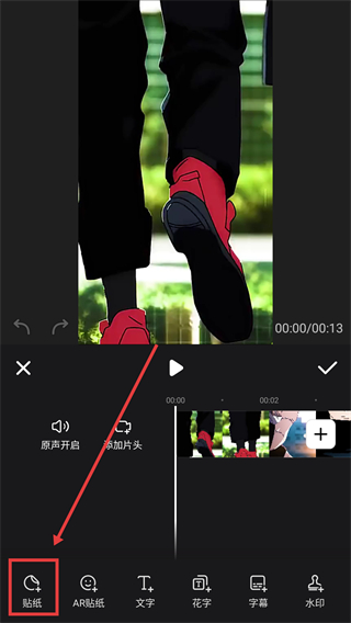 1、在视频剪辑页,点底部的【贴纸】选项,可打开贴纸功能栏,给视频添加装饰元素哦。