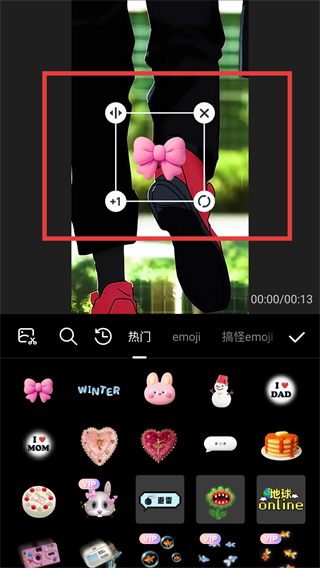4、贴纸添加到视频后,可通过调节框调整其位置、大小,让装饰效果更贴合视频内容呢。