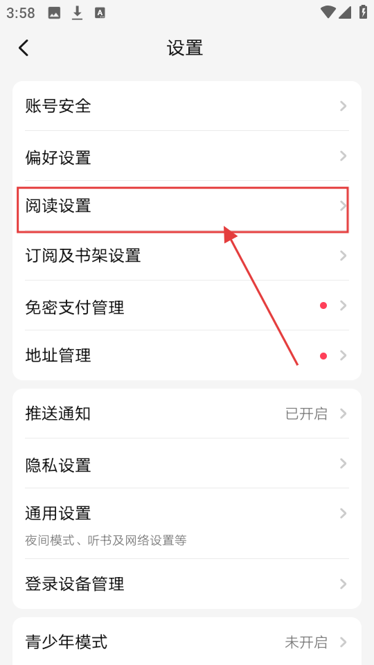 2、在设置界面,找到【阅读设置】选项并点击,这样就能进入阅读相关的设置页面啦。