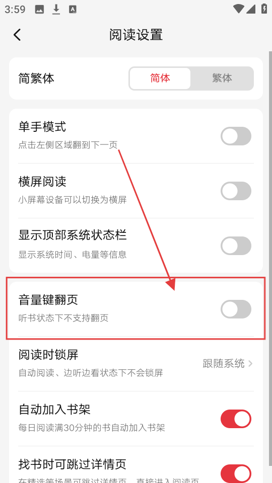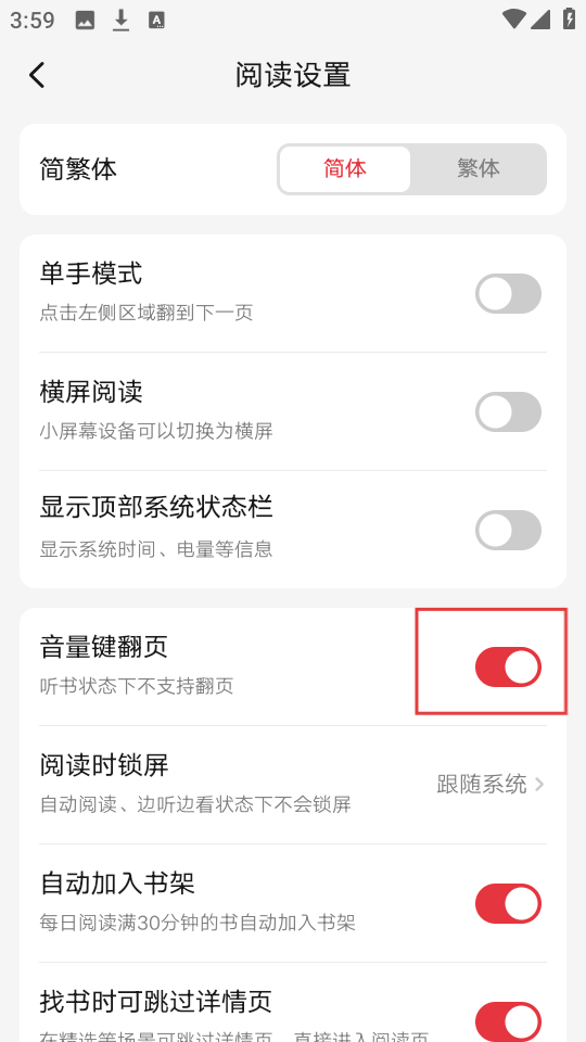 3、进入阅读设置页面后,找到【音量键翻页】选项,它能让你用音量键来翻页,超方便的。
